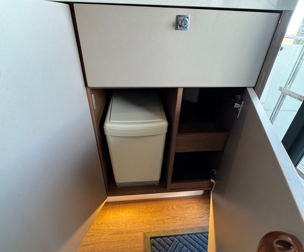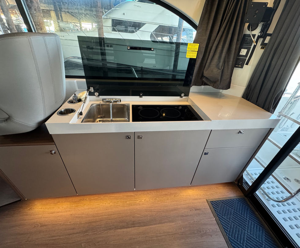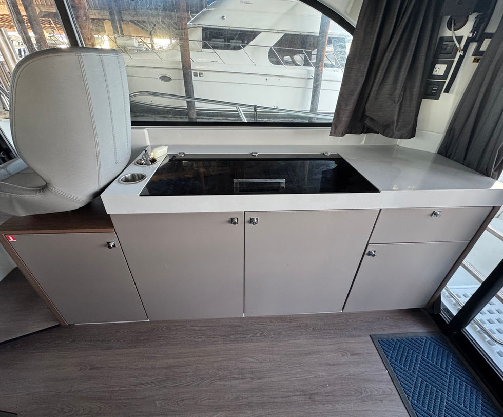 The Antares 11 Fly is also equipped with Mercury Twin 300 V8 four stroke outboard motors with Joystick docking, zipwake auto trim tabs, bow thruster, Garmin 16" color multi function display chart/radar, Starlink 18x, Garmin VHF Radio, remote spotlight, Mercury diagnostic display, lower helm station side door access to deck, triple sliding aft cockpit door, aft cockpit L-Shaped vinyl seating, hydraulic platform, bridge vinyl seating with table, forward vinyl sunpad lounges, lower station windshield wipers, blue LED underwater lights, Dometic A/C - Heating 28,000 BTU, Fischer Panda diesel generator, master stateroom with full head and separate shower, closet storage, VIP Guest Stateroom, stamoid seating and table covers for cockpit, bridge and forward sunpads, galley with refrigerator / freezer, 2 burner stove, sink, storage cabinets, and seating with expandable table.